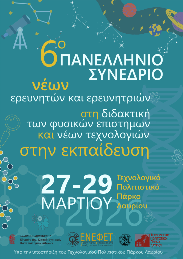 Το Παιδαγωγικό Τμήμα Δημοτικής Εκπαίδευσης του ΕΚΠΑ και η Ένωση για την Εκπαίδευση στις Φυσικές Επιστήμες και την Τεχνολογία (ΕΝΕΦΕΤ), υπό την υποστήριξη του Τεχνολογικού Πολιτιστικού Πάρκου Λαυρίου, διοργανώνει το 6ο Πανελλήνιο Συνέδριο Νέων Ερευνητών και Ερευνητριών.